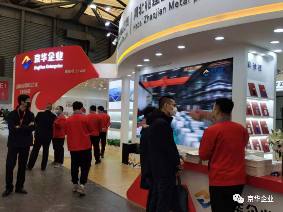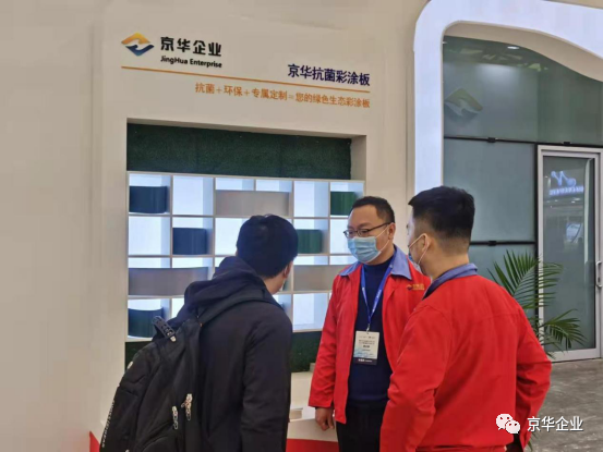 展覽會上各界人士紛至沓來,京華兆建作為金屬板材涂鍍解決方案專業(yè)供應(yīng)商,在展位上部署了專業(yè)的工作人員,為來往人員進(jìn)行耐心詳盡地講解,并展示高端彩涂板系列產(chǎn)品樣板。京華兆建的生產(chǎn)產(chǎn)品涵蓋精品冷軋板、熱鍍鋅板、熱鍍鋁鋅板、高強(qiáng)結(jié)構(gòu)鋼板、建筑彩涂板、京華精品板、高端彩涂板、醫(yī)院用抗菌彩涂板、畜牧業(yè)用彩涂板、凈化板、家電用彩涂板等多個(gè)領(lǐng)域。展位E1-A02上包括且不僅限于氟碳彩涂板、抗菌彩涂板、高耐候彩涂板等擁有科技專利的高端彩涂板呈現(xiàn)。